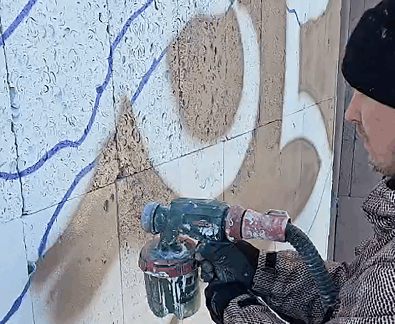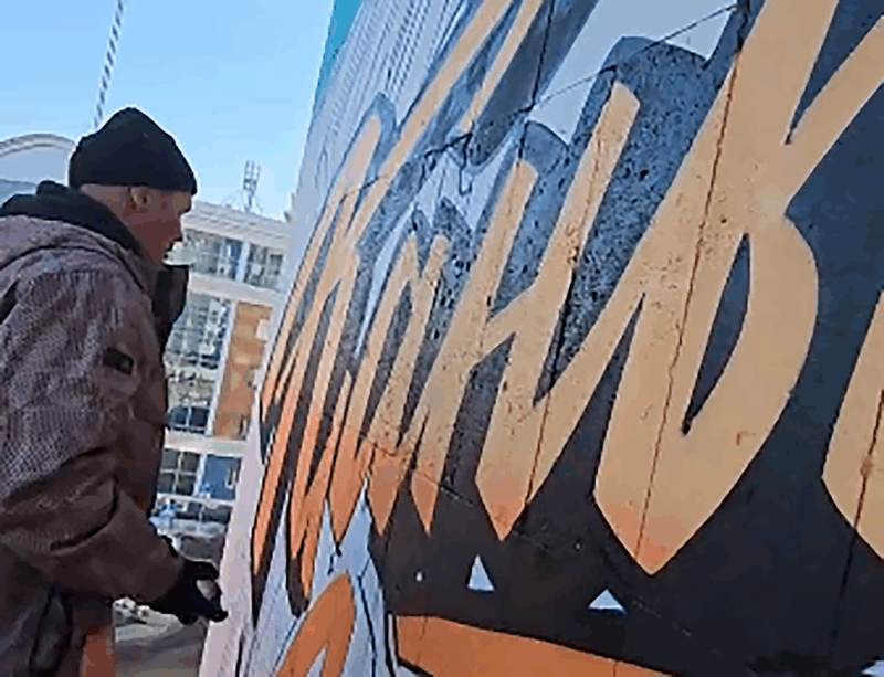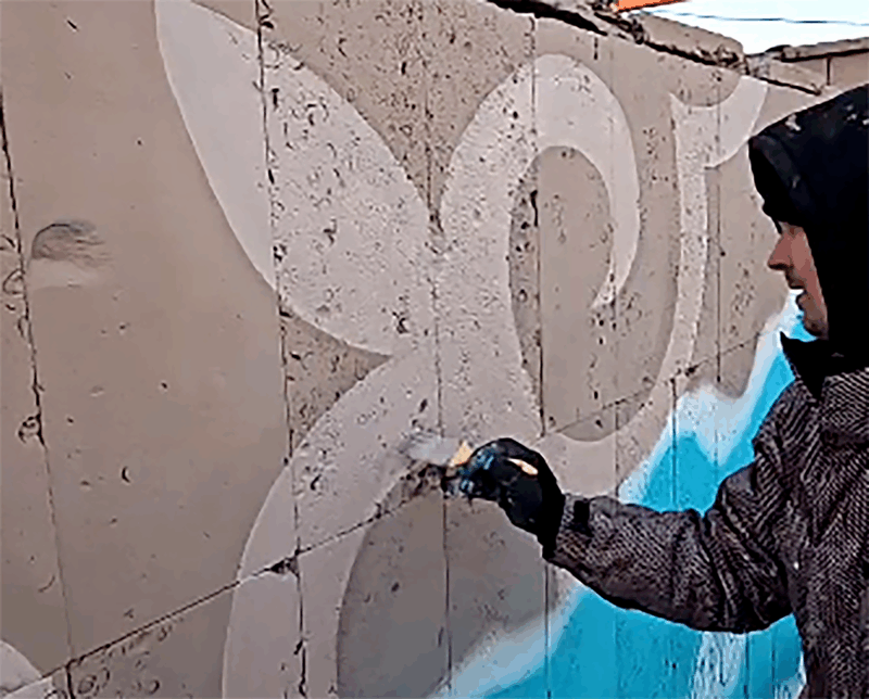 Граффити-художники или, как принято их называть в своей среде, райтеры Владимир Зубко и Руслан Касимов работают над самым большим портретом прославленного земляка и днем, и ночью. Прежде чем начать трудиться над муралом, ребята наносят разметку на девятиэтажную стену под покровом темноты, проецируя многократно увеличенное изображение на бетон. Только так лицо на будущем портрете будет «живым»: с градиентом, светотенями и т.д.