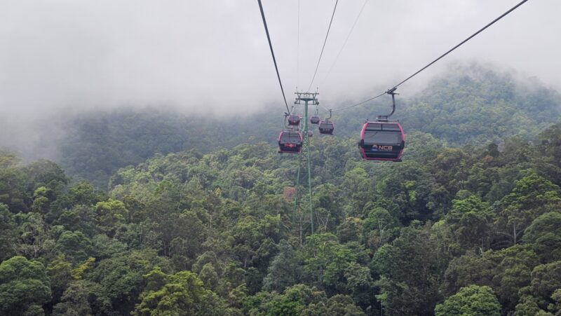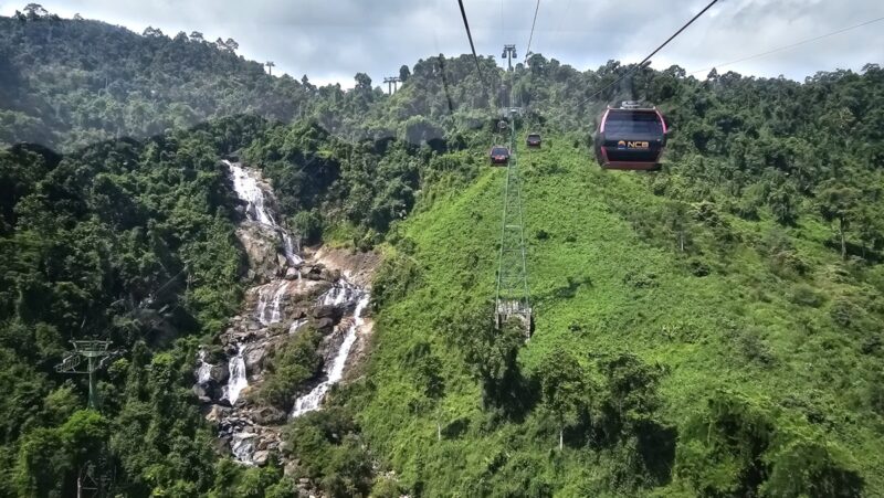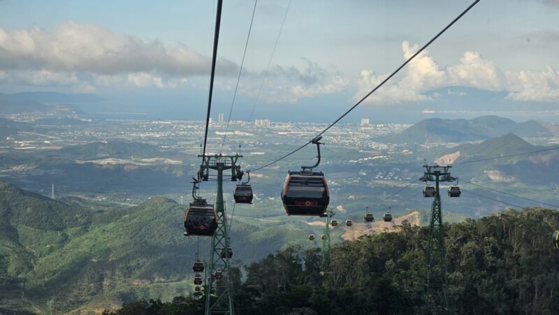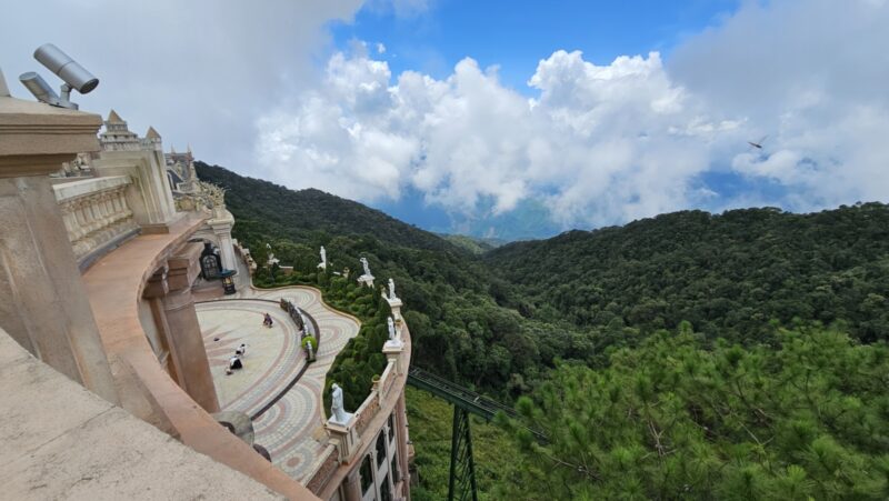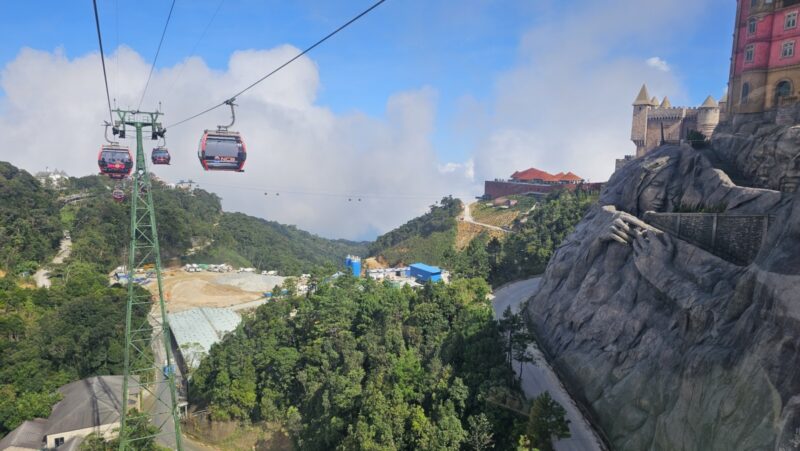 Строго говоря, система канатных дорог в Ba Na Hills включает не одну, а три линии, которые доставляют гостей в разные части парка. И эта канатная дорога в буквальном смысле возносит посетителей «над облаками». Поднимаясь на вершину горы, можно довольно долго наслаждаться потрясающими видами джунглей, гор и водопадов. В ясную погоду из кабинки канатной дороги виден практически весь Дананг. Но потом кабина поднимается выше, попадает в облака и вокруг становится довольно темно…