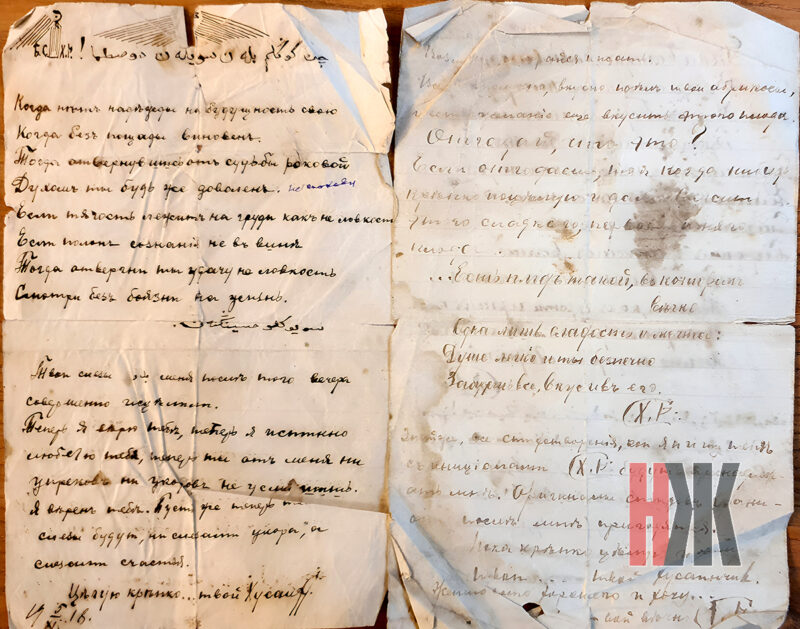 С Марусей было условлено, что она из своего окна будет сигнализировать о ходе переговоров…. Окно почты, где я работал, стояло против окна Маруси. Сигнал подавался ею платочком. Я же из противоположного окна следил. В эти мгновения мы витали как бы в облаках, сердца наши стучали, мы волновались, предчувствуя нашу вечную недалекую встречу и обоюдные обнимания.