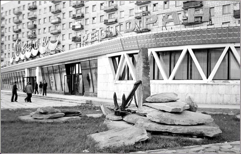 Рядом с магазином «Океан» в 80-х годах распахнул свои двери одноименный фирменный ресторан, поход в который, как говорят сейчас, был статусным мероприятием. И там же на тяжелых цепях установили якорь.