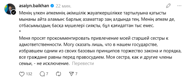 «Меня просят прокомментировать привлечение моей старшей сестры к адмответственности. Могу сказать лишь, что в нашем государстве, избравшем одним из своих базовых принципов торжество закона и порядка, все граждане равны перед правосудием. Моя сестра, как и другие члены семьи, — не исключение», — написал Асаин Байханов.