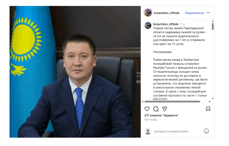 Ранее казахстанский журналист Михаил Козачков сообщил в своих соцсетях, что полицейские Экибастуза задержали сестру акима Павлодарской области за вождение в нетрезвом виде. А суд лишил ее водительских прав на семь лет, назначив при этом 15 суток административного ареста.