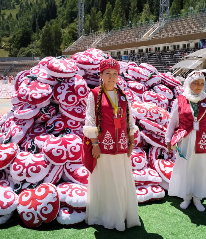 Во второй раз мы собрались в 2024 году, на Пятых Всемирных Играх Кочевников, где 450 участниц соединили корпешки в большую композицию вокруг Тайказана. Тогда проект вошёл в казахстанскую Книгу рекордов.