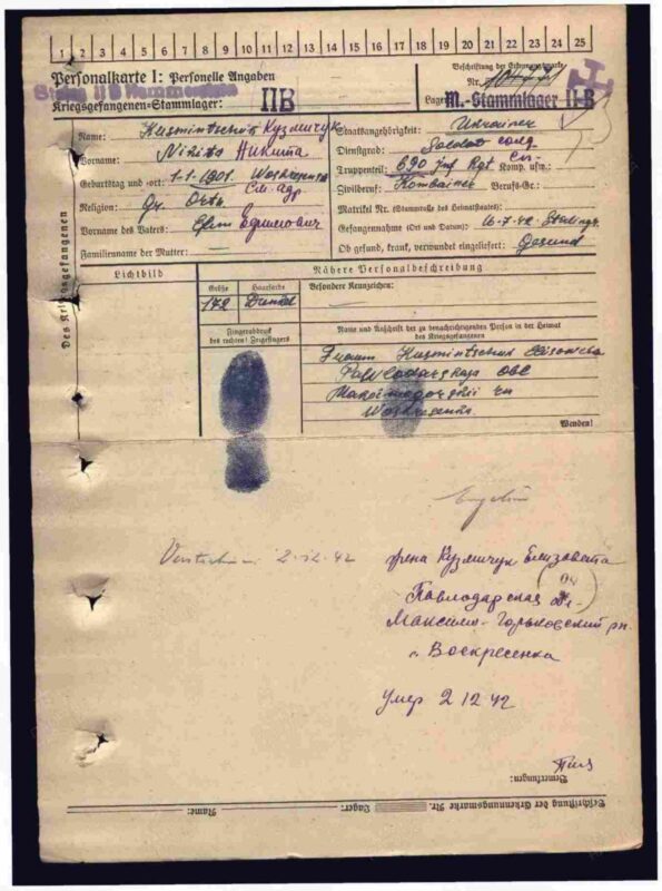 Павлодарский поисковый отряда «Майдан Жолы» разыскивает родственников красноармейца Никиты Ефимовича Кузьмичука, который в 1942 году попал в плен в Сталинграде и погиб в немецком лагере в оккупированной Норвегии, передает @lifepvl.kz.