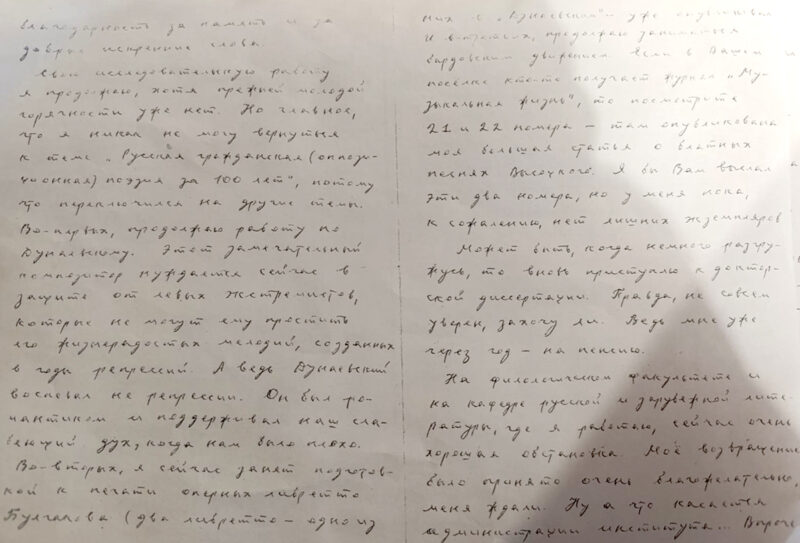 «Во-первых, продолжаю работу по Дунаевскому. Этот замечательный композитор нуждается сейчас в защите от левых экстремистов, которые не могут ему простить его жизнерадостных мелодий, созданных в годы репрессий. А ведь Дунаевский воспевал не репрессии. Он был романтиком и поддерживал наш слабеющий дух, когда нам было плохо. Во-вторых, я сейчас занят подготовкой к печати оперных либретто Булгакова (два либретто – одно из них в «Дунаевском» — уже опубликовал). И в-третьих, продолжаю заниматься бардовским движением. Если в вашем поселке кто-то получает журнал «Музыкальная жизнь», то посмотрите 21 и 22 номера – там опубликована моя большая статья о блатных песнях Высоцкого. Я бы Вам выслал эти два номера, но у меня пока, к сожалению, нет лишних экземпляров…», — пишет Шафер.