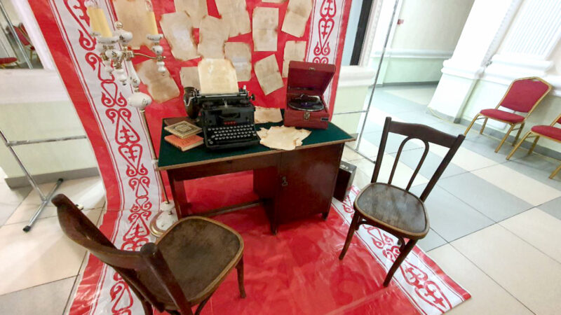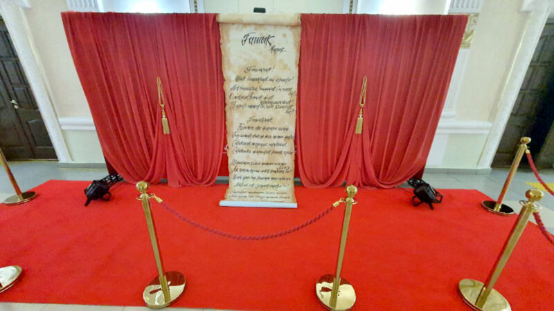 Огромный интерес у зрителей вызвало оформление центрального фойе филармонии, где в честь 95-летия Мукагали Макатаева организовали специальную фотозону. В стилизованном «кабинете поэта» были представлены предметы-подлинники первой середины прошлого века: стол с зеленым сукном, историческая модель печатной машинки «Concordia», старинный светильник, небольшой деревянный чемодан, другие оригинальные экспонаты. С большим удовольствием зрители делали памятные снимки на фоне баннера, где разместился огромный фрагмент текста из стихотворения Мукагали Макатаева «Ғашық жүрек».