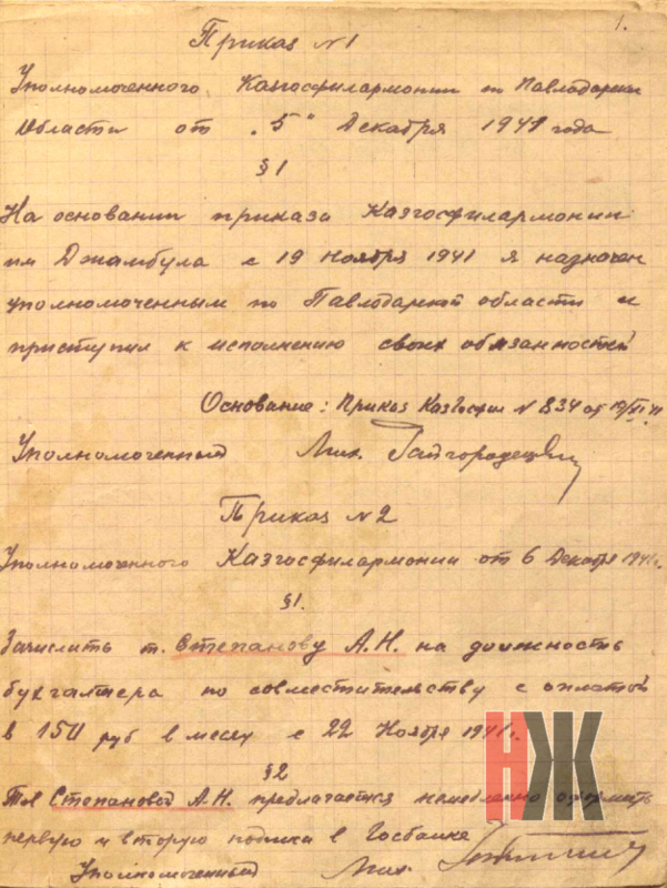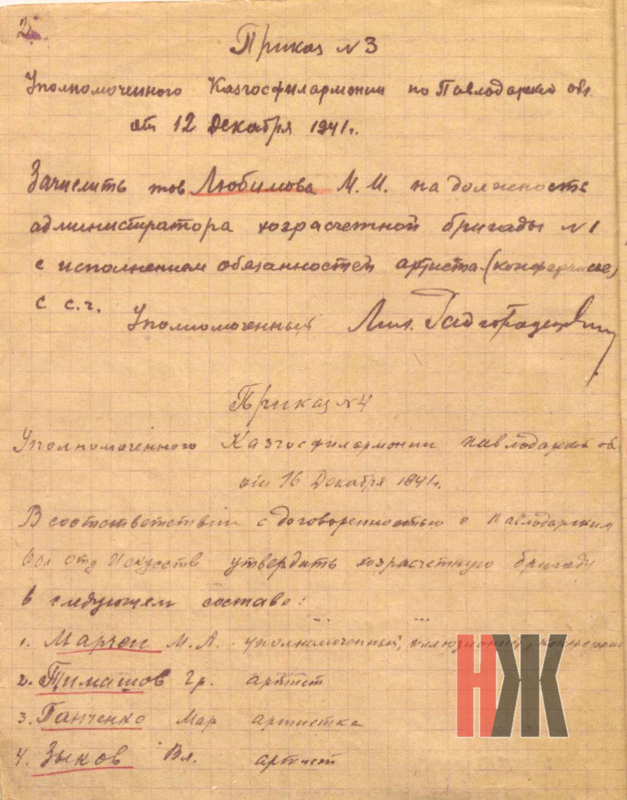 «Из приказов, написанных от руки, мы узнаем, что Павлодарская филармония открылась в самый сложный период – в первый год Великой Отечественной войны. Тогда это был филиал Казахской Государственной филармонии им. Джамбула. А его уполномоченным был Михаил Гайгородецкий. Ранее ни в одной книге по истории Павлодарской области его имя не упоминалось. Другой ценный документ – поздравление артистов с первой годовщиной работы филармонии от исполкома областного совета депутатов трудящихся и областного комитета коммунистической партии. Там же слова благодарности за то, что в самый тяжелый момент они своим искусством поднимают дух населения, так сказать «куют победу в тылу». Началась война, не хватает ни инструментов, ни костюмов, ни реквизита и партитур, а артисты уже в первый год дают концерты по всей области. Им на помощь приходят эвакуированные из оккупированных территорий деятели искусства. Далее следуют не менее интересные материалы от 1943 года и так далее», — продолжает спикер.