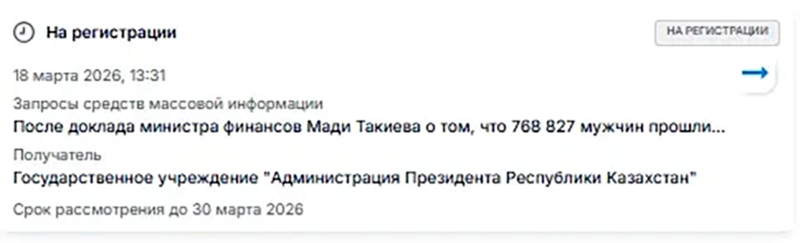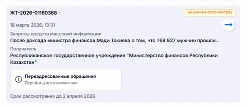 В тот же день запрос был переадресован в ГУ «Министерство финансов Республики Казахстан» со сроком рассмотрения до 2 апреля.