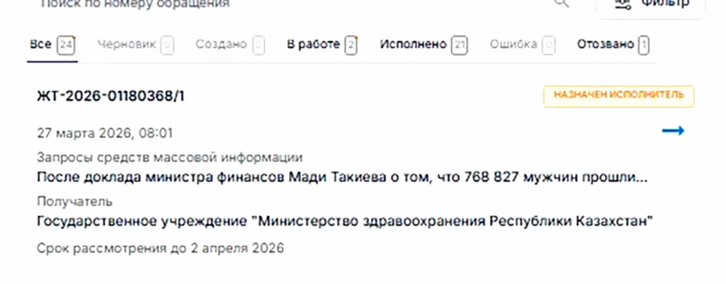 27 марта запрос был переадресован в ГУ «Министерство здравоохранения Республики Казахстан».