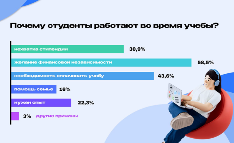 За этим выбором стоит необходимость в деньгах. По данным опроса, большинство обучающихся стремятся к финансовой независимости и возможности самостоятельно покрывать свои расходы. Для некоторых необходимость самим оплачивать обучение становится определяющим фактором и вынуждает выходить на смену даже в ущерб учебному процессу. Другим попросту не хватает стипендии для покрытия базовых расходов, отчего им приходится искать дополнительный заработок.