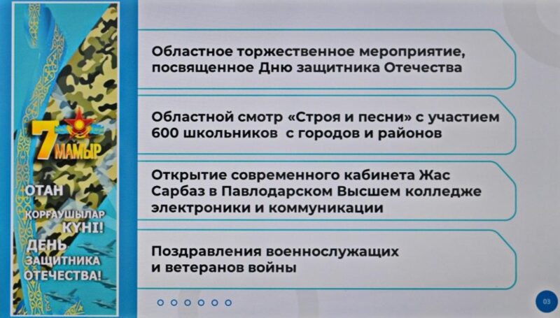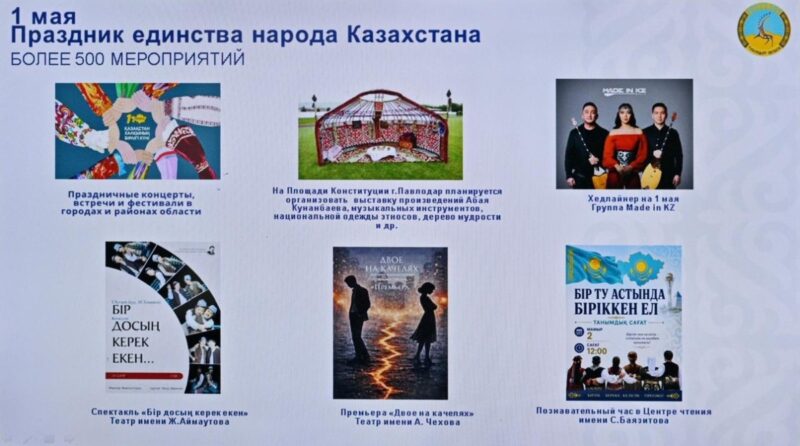 Так, 1 мая, в День единства народа Казахстана по области пройдет более 500 мероприятий. Центральное празднование состоится в Павлодаре на площади Конституции с участием творческих коллективов, этнокультурных объединений и Ассамблеи народа Казахстана.